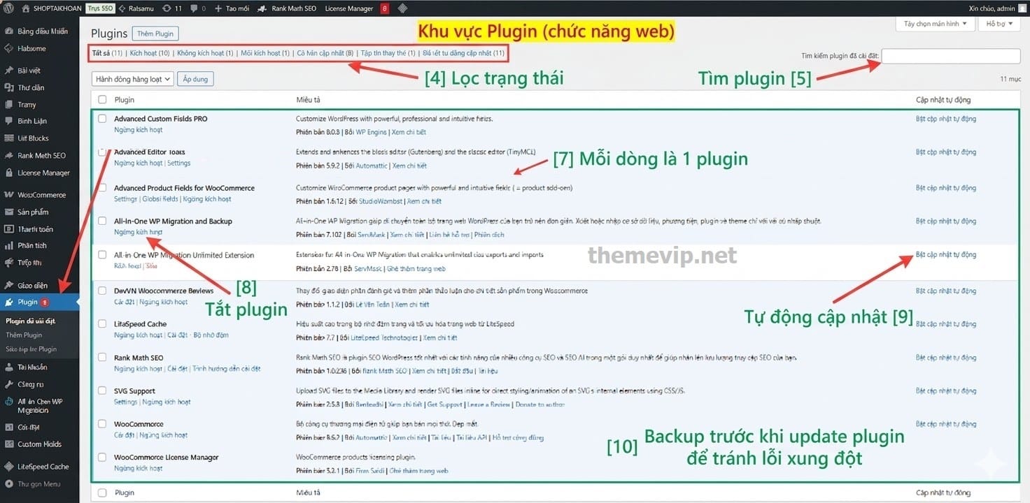 Phần nội dung bên phải: Hiển thị chi tiết nội dung bạn đang làm việc (trong hình là danh sách plugin).